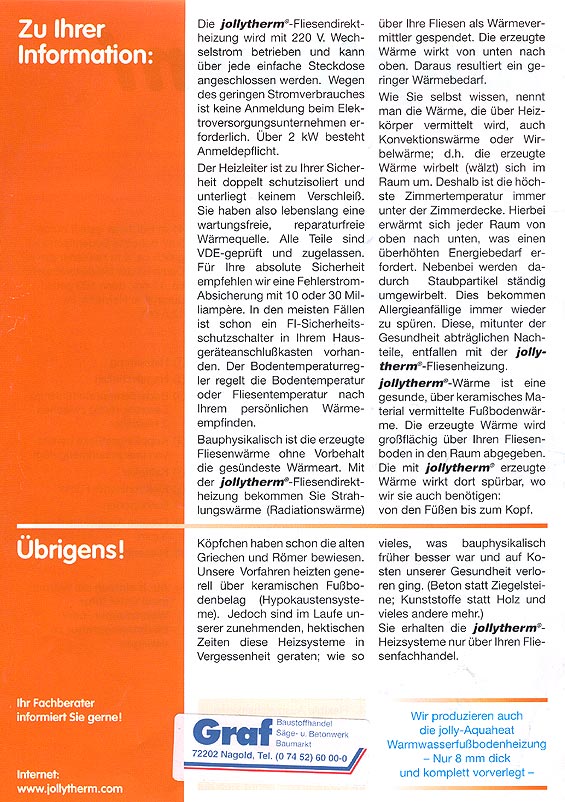 Die jollytherm-Fußbodenheizungen sind preiswerte, solide, wartungsfreie Zusatz- oder Vollwertheizungen:
