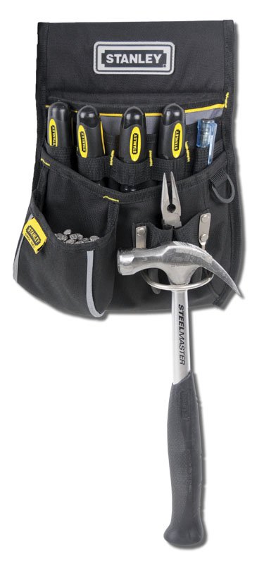 - Zwei Nageltaschen, eine Bandmaßtasche und ein integrierter Hammerhalter