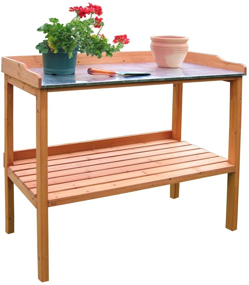 Die Arbeitsfläche selbst hat Maße von etwa 98 x 48cm und bietet so genügend Platz für alle wichtigen Gartenarbeiten wie Umtopfen oder Einpflanzen. Sie ist von drei Holzleisten umrandet, sodass Töpfe, Pflanzen oder Arbeitsgeräte nicht versehentlich herunterrutschen.
