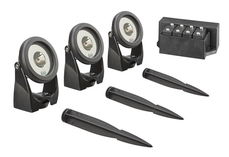 - Im Lieferumfang enthalten: 3 Leuchten mit je 5 m Kabel, LED-Treiber mit Anschlussmöglichkeit für 4 Leuchten sowie 3 Erdspieße