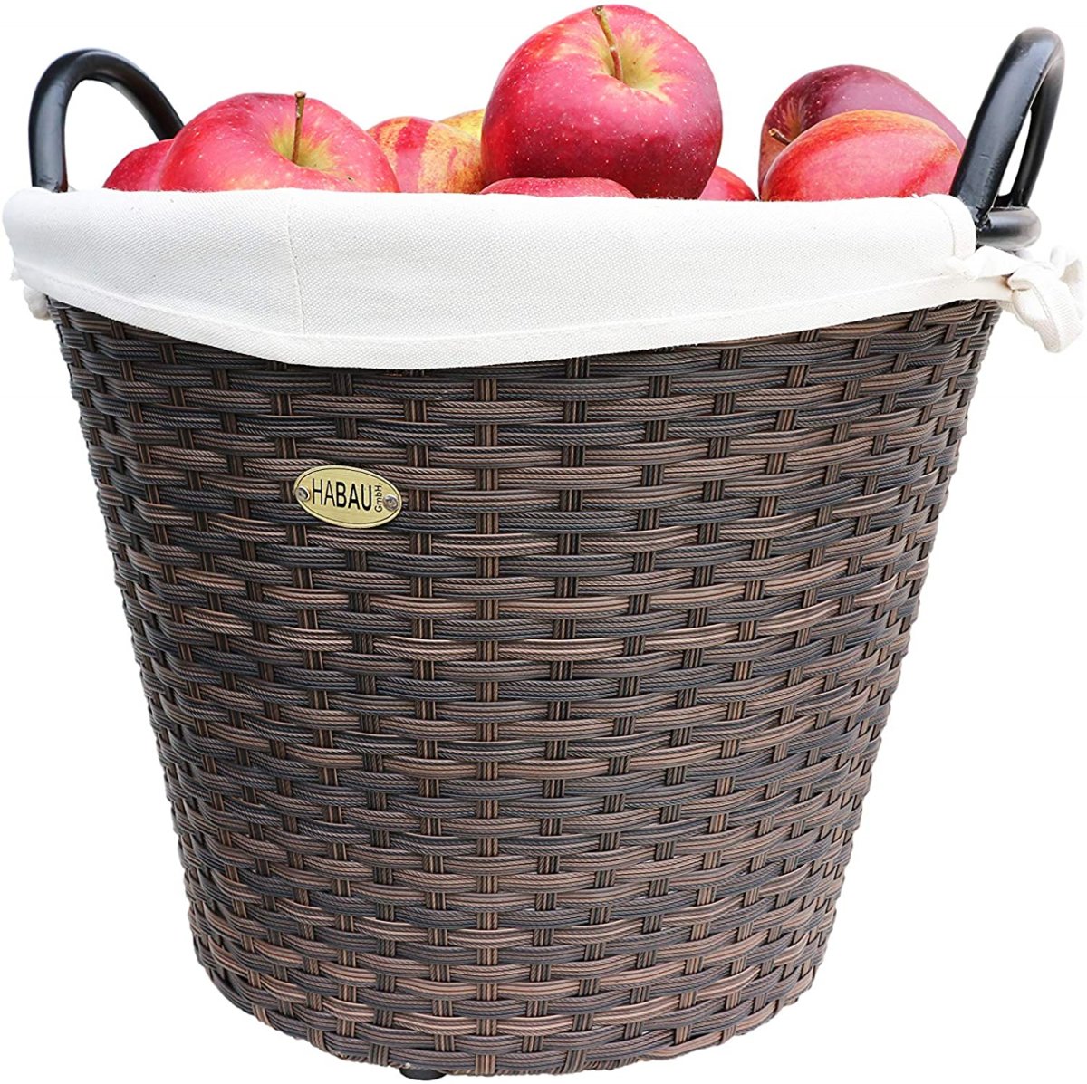 - Ein eingearbeitetes Metallgestell und ein schwarzer Metallring mit zwei großen Griffen aus Metall bieten einen sehr stabilen Korb und lassen einen sehr guten Tragekomfort zu