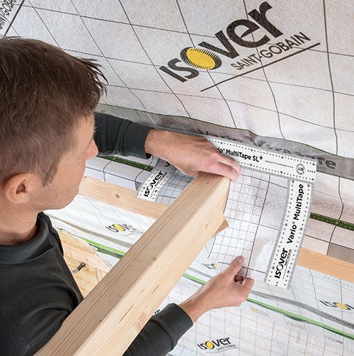Das ISOVER Vario® MultiTape SL + mit dem geteiltem Abdeckstreifen ermöglicht die luftdichte Verklebung auch in verwinkelten Bereichen wie Ecken, bei Anschlüssen oder auch bei Dachdurchdringungen der ISOVER Vario® Klimamembranen und PE-Folien. Ebenso ist es prädestiniert für Sparren, Zangen, Türen und Fenster. Ein extrem wasserbeständiger Kleber gewährleistet zusätzliche Sicherheit und ermöglicht die Verklebung der luftdichten Ebene auch im Außenbereich, sowie die Verklebung von Unterdeckbahnen. Unter Verwendung des Vario®-Komplettsystems können Sie Bauschäden vermeiden – ein Gebäudeleben lang.