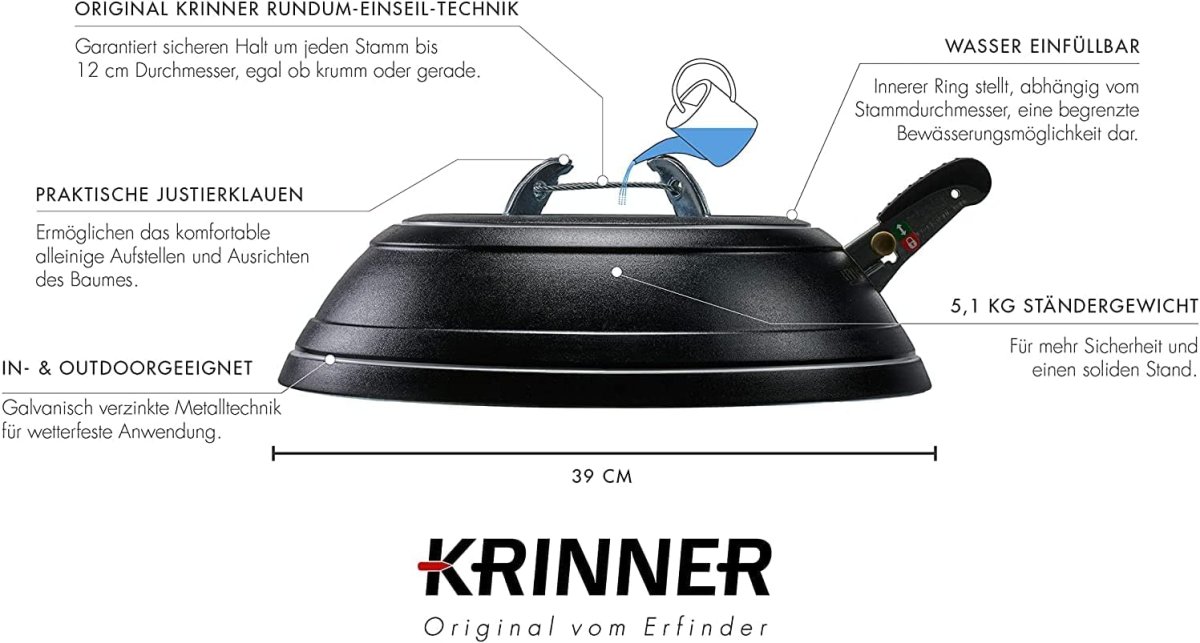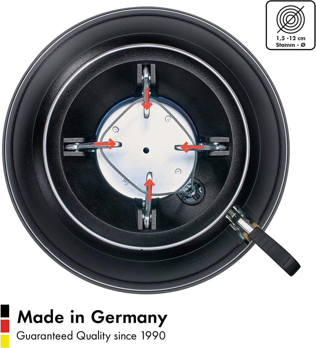 Die Original Krinner Rundum-Einseil-Technik garantiert den gleichmäßigen Druck der Klauen an den Stamm. Einfach den Baum in den Ständer stellen, das Fußpedal treten, fertig! Ob dick, dünn oder krumm gewachsen, der Baum steht sicher und kerzengerade.