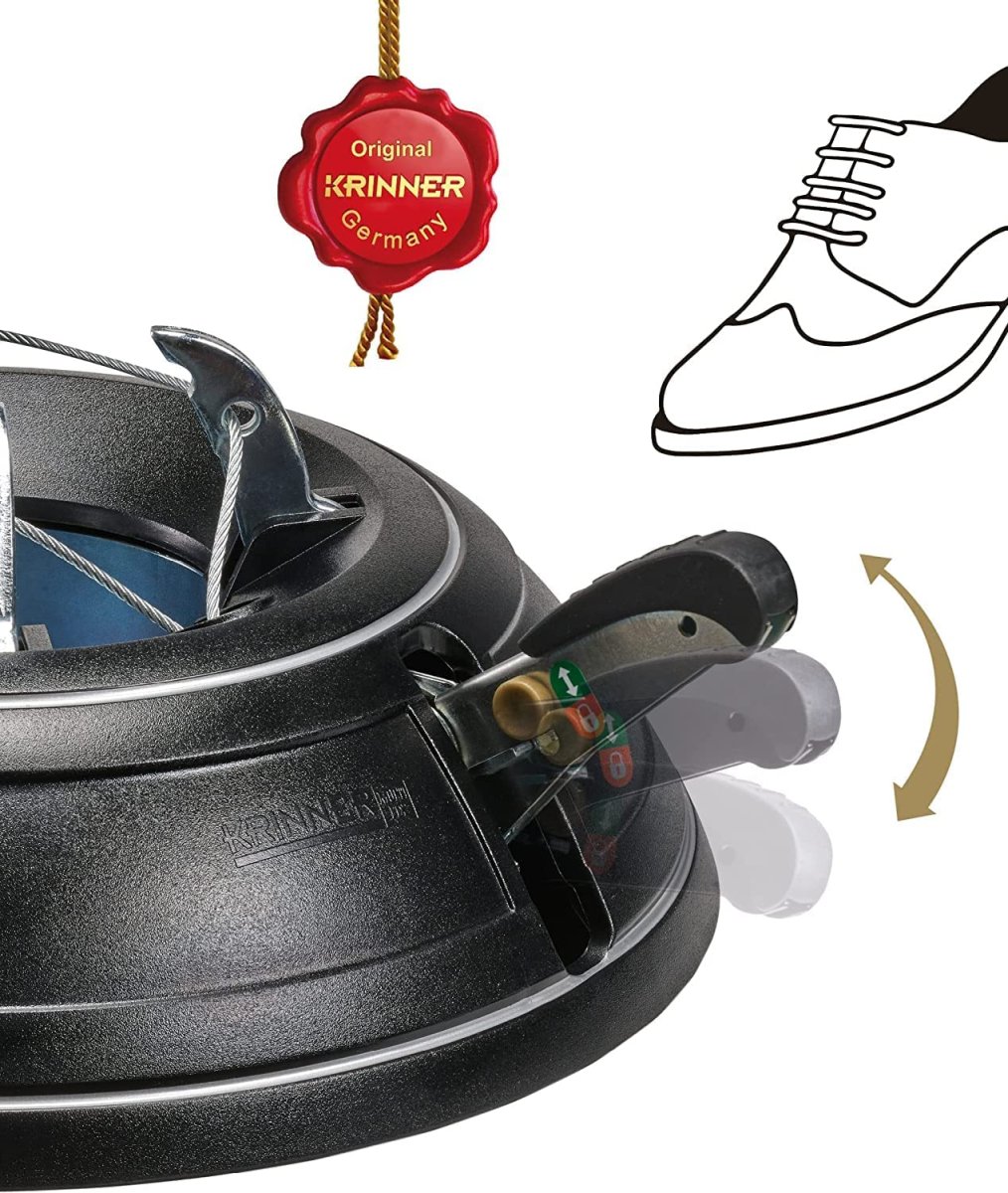 - Verschlussmechanismus: Einfach den Baum in den Ständer stellen, das Fußpedal treten, Sicherungshebel feststellen, fertig!