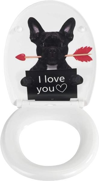 - Hochwertiger WC-Sitz mit ovaler Deckelform aus strapazierfähigem Duroplast mit aufwendigem Hunde-Motiv