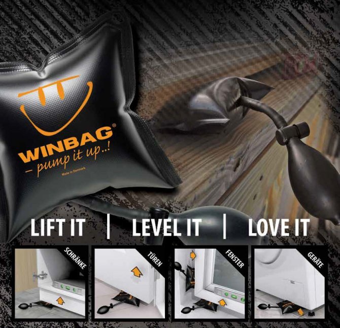 Sie sparen Zeit und häufig sogar den zweiten Mann zum Halten und Einpassen – das macht jetzt der WINBAG® für Sie! Dieses leistungsstarke Luftkissen aus faserverstärktem Material wird kinderleicht mit einer Hand aufgepumpt. 250 kg Druck hält der WINBAG® aus – so können Sie selbst in Verbindung mit Keilen und Distanzhalter schwere Fenster, Türen, Schränke oder Geräte millimetergenau justieren und positionieren. So sparen Sie viel Zeit, Kraft und Geld.