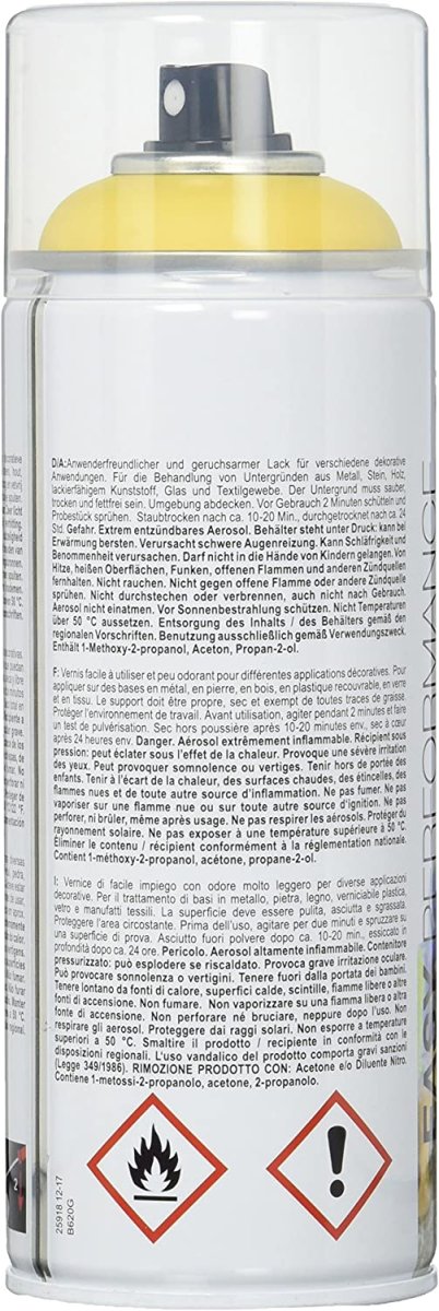 Innovativer Sprühlack für einfache Anwendung und hohe Verläßlichkeit für eine perfektes Sprühergebnis: Kann sowohl auf Kunstharzlacken (Alkydlacken) als auch auf Acryllacken angewendet werden! Der neutrale Duft ermöglicht das Sprühen im Außen- und Trocknen im Innenbereich. Sehr anwenderfreundlicher Sprühlack, da leicht zu sprühen und mit einer hohen Deckkraft und Haftung ausgestattet.