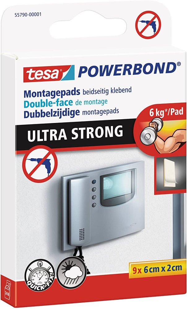 Die tesa Powerbond® Ultra Strong Pads sind mit ihrer Klebeleistung von bis zu 6 kg pro Pad eine echte Alternative zu Schrauben und Nägeln. Dank der überlegenen tesa ®-Klebetechnologie sind die extra starken Klebepads in der Lage, auch schwerere Gegenstände im Innen- und geschützten Außenbereich dauerhaft, zuverlässig und sicher zu halten.
