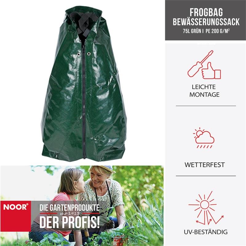 Der NOOR Frogbag Bewässerungssack hat mit einer Größe von ca. 90 x 52 x 84 cm ein Fassungsvermögen von bis zu 75L und bietet eine 5-8 Stündige Wasserabgabe. Das spart nicht nur Zeit und Kosten, sondern auch enorme Mengen an Wasser, gegenüber einer einfachen Bewässerung, bei der ein Großteil des Wassers verdunstet. Der Frogbag aus reißfestem, UV beständigem Original Noor Bändchengewebe Super 200 gr/m² aus 100% Polyethylen besitzt einen robusten Reißverschluss von YKK und sorgt für eine effektive, punktgenaue Wasserabgabe direkt über dem Wurzelballen. Er ist für einen Stammumfang von 8cm bis 30cm geeignet und ist bei größeren Stämmen erweiterbar durch seitliche Reißverschlüsse mit mehreren Säcken.