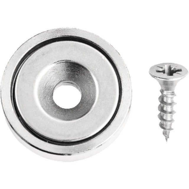 Scheibenmagnet mit Rundloch aus Neodym, verchromt, mit starker Haftkraft, inklusive Senkkopfschraube PZ in Edelstahl rostfrei A2.