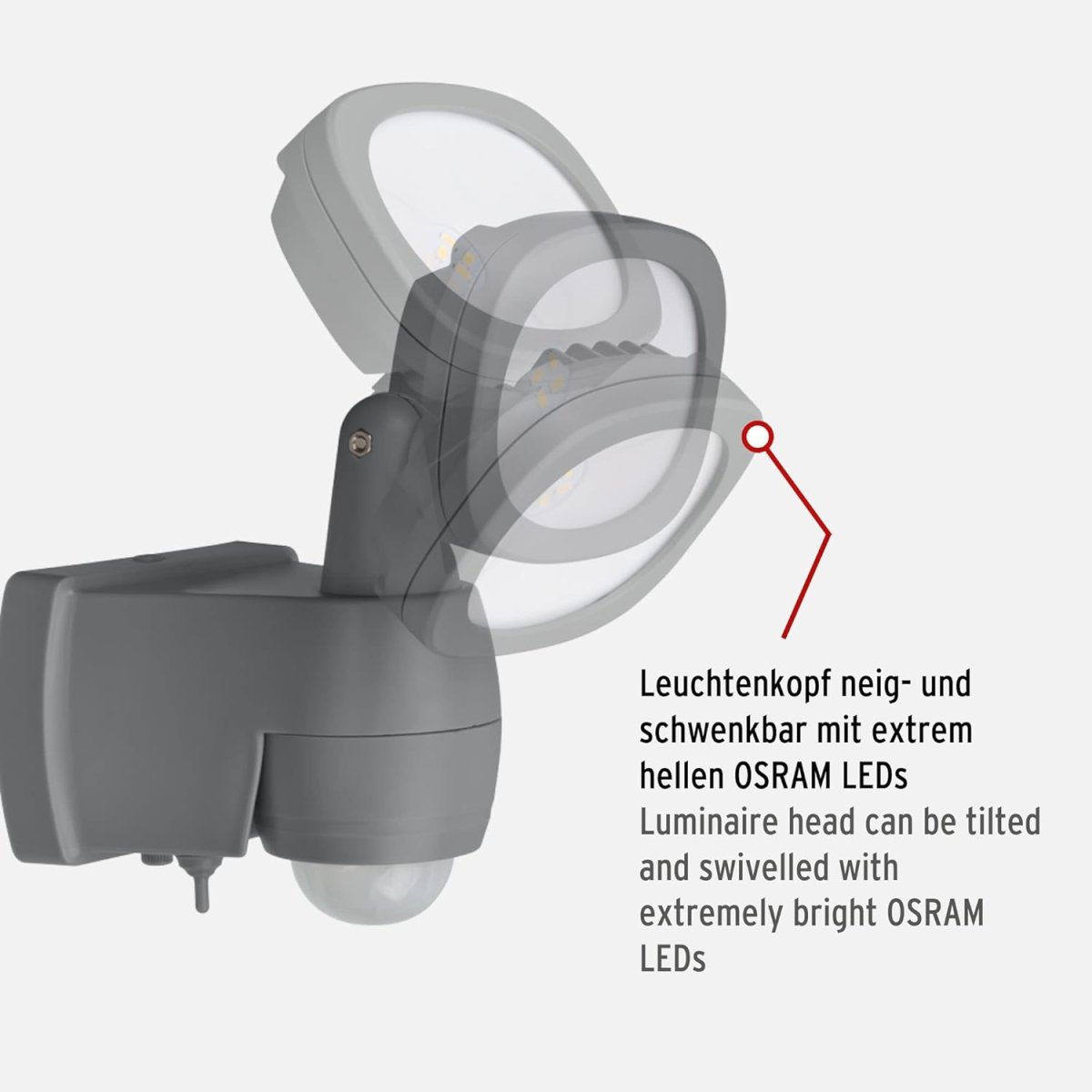 Der batteriebetriebene LED Strahler mit Bewegungsmelder lässt sich flexibel, ganz ohne Kabel an der Wand montieren. Ganz egal ob eine einfache Montage im Innen- oder Außenbereich gewünscht ist, der Wandstrahler verfügt über die Schutzart IP44 und ist somit bestens für beide Einsatzorte geeignet. Mit Hilfe der 8 superhellen, hochwertigen Marken LED´s werden beispielsweise Hauseingänge oder Kelleraufgänge bestens ausgeleuchtet. Der Leuchtenkopf der batteriebetriebenen Wandleuchte ist zudem neig- und schwenkbar und lässt sich somit individuell einstellen. Der Infrarot Bewegungsmelder verfügt über einen 180° Erfassungswinkel und einer 10m Reichweite. Zudem ist die Einschaltdauer bis 30sec einstellbar. Der LED Strahler mit Batterie verfügt außerdem über eine praktische und zugleich batteriesparende Zusatzfunktion vom Licht (100 % Licht - 50 % Licht - aus) und überzeugt außerdem durch folgende Eigenschaften: