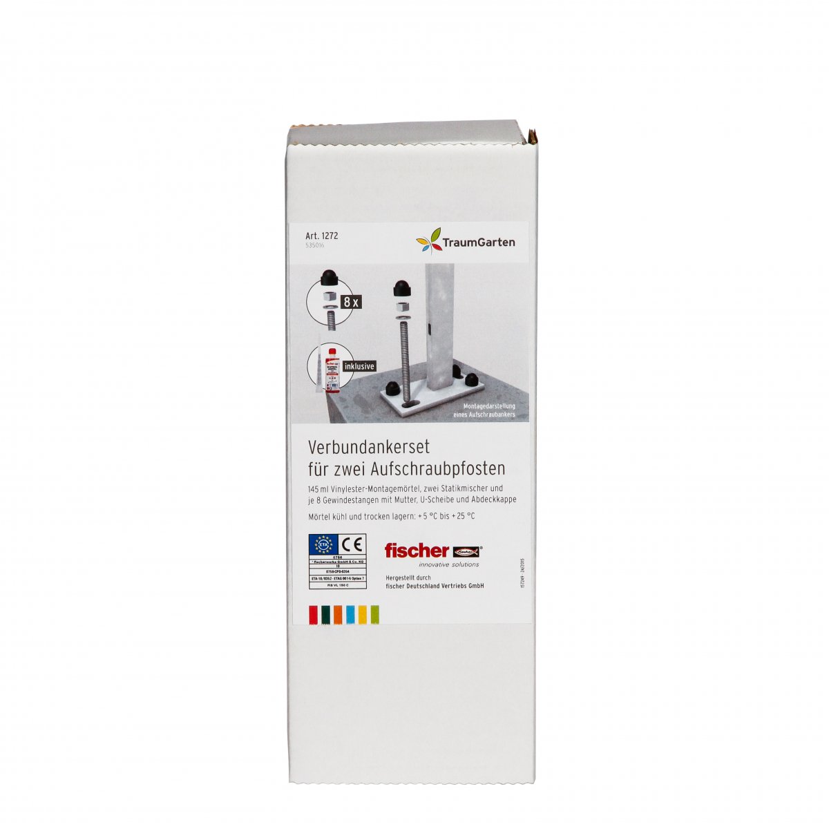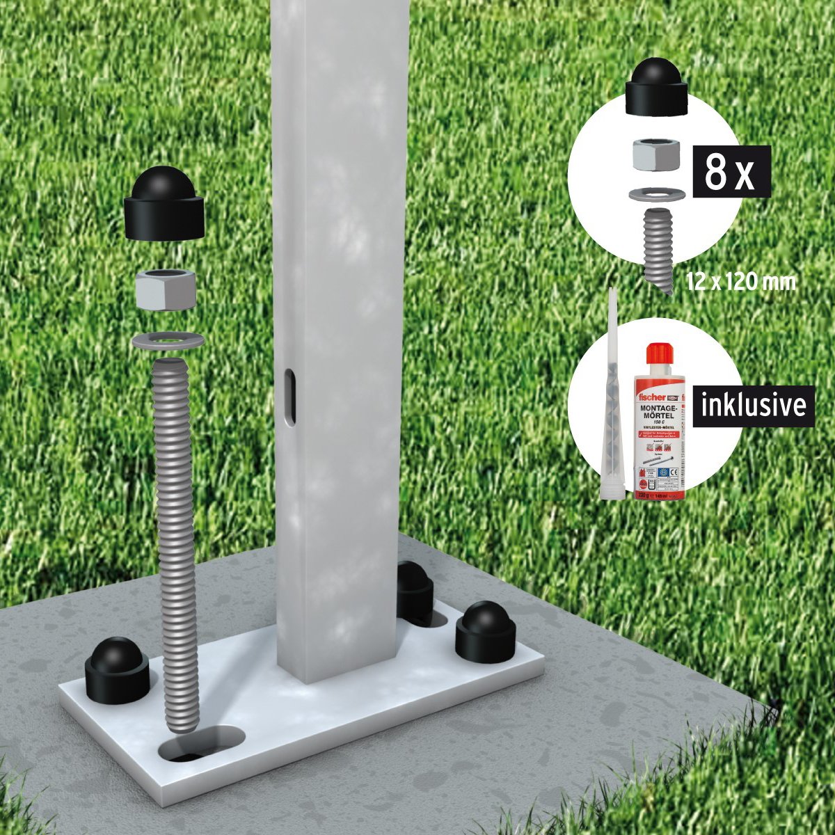 Montagemörtel und Gewindestangen zur Befestigung von Aufschraubpfosten. Set ausreichend für 2 Aufschraubträger.