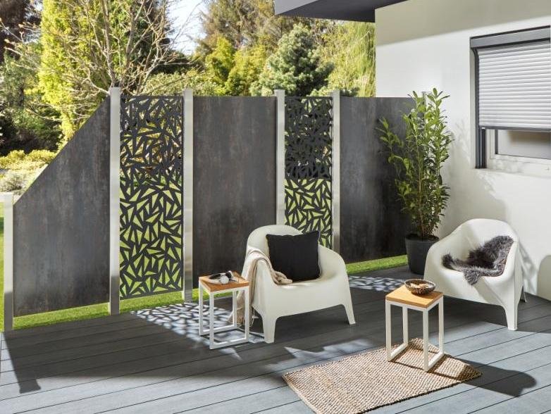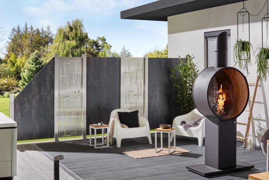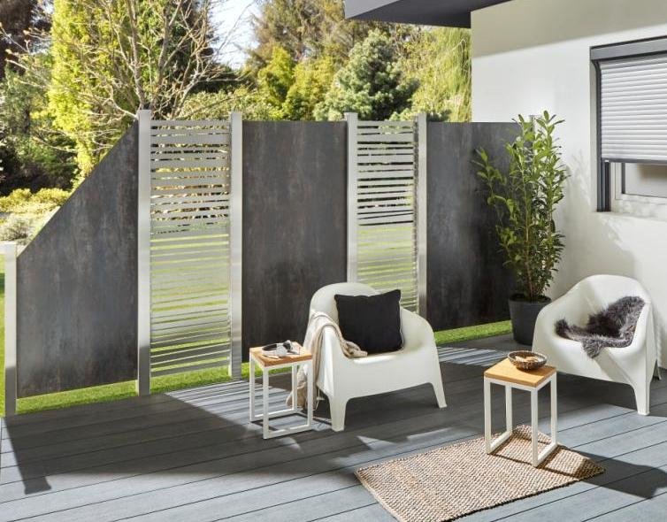 Blickdichte Sichtschutzelemente aus hochwertigen Keramikplatten in Steinoptik.