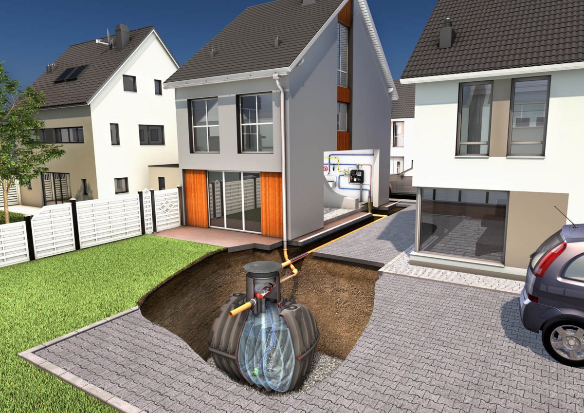- Für große Entfernungen (grösser 15 m) zwischen Tank und Gebäude