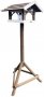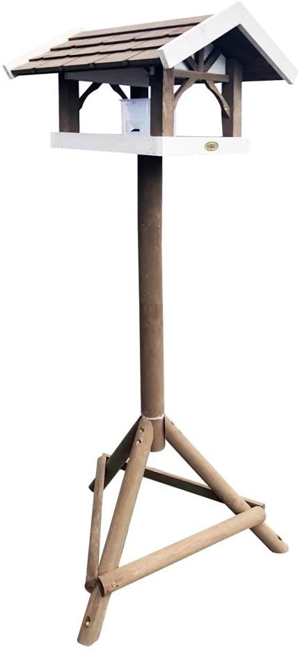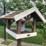 Das braun/weiß lasierte Vogelhaus wird komplett mit Ständer im Karton geliefert. Das Dach ist mit Holzschindeln bedeckt. Durch die offene Konstruktion können die Vögel von allen Seiten ans Futter kommen. Das speziell von uns entworfene Silo mit Fassungsvermögen von ca. 450 ml lässt sich einfach herausnehmen und befüllen.