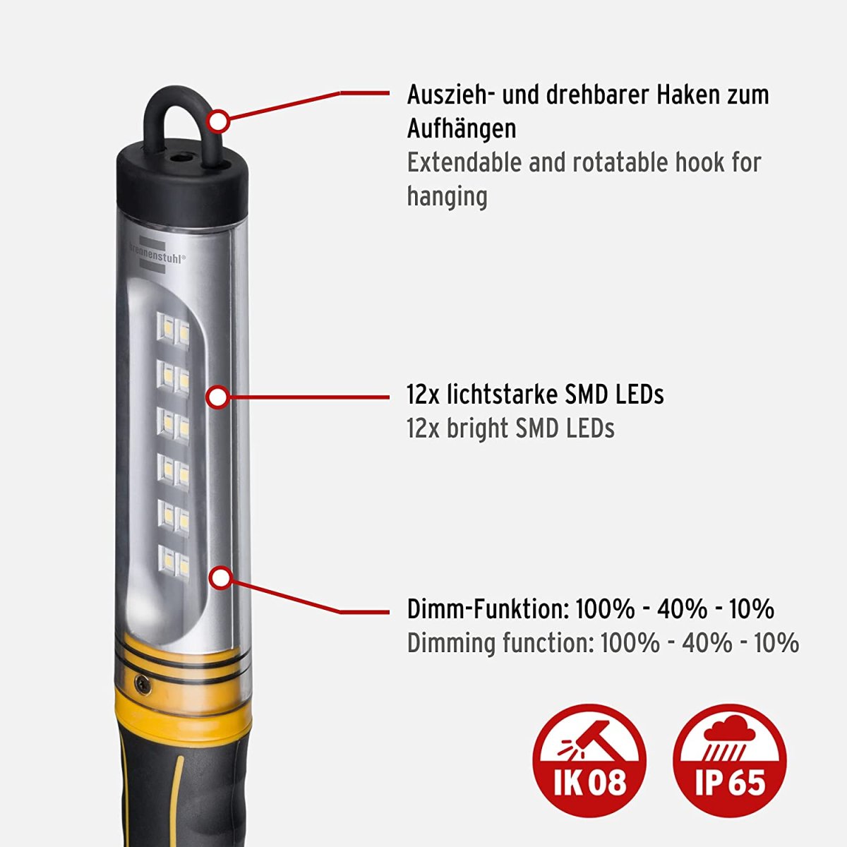 - Werkstattlampe mit schlag- und bruchfestem Schutzrohr (IK07 Schutz) mit stabilem, auszieh- und drehbarem Haken zum Aufhängen