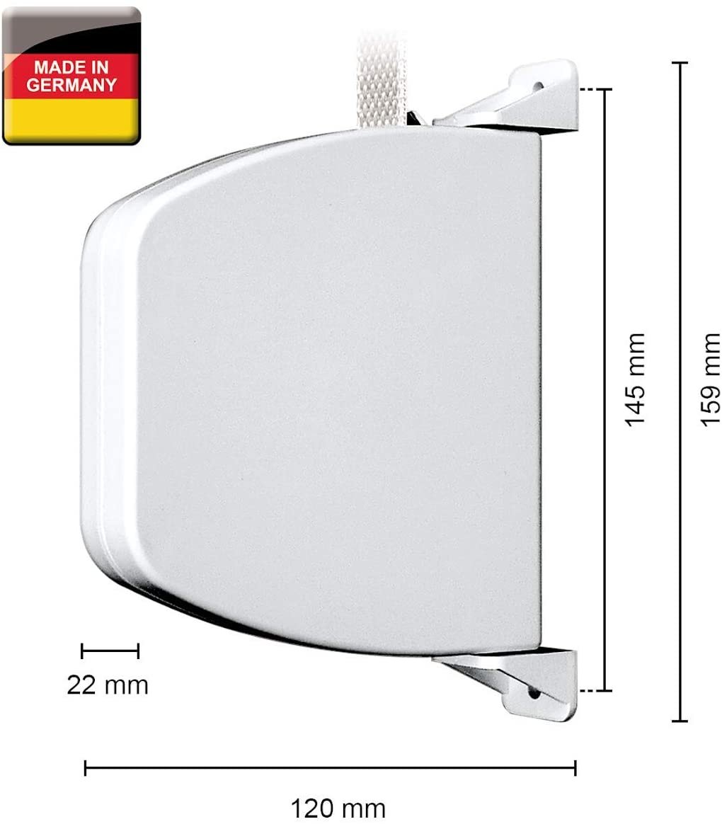 Der Gurtwickler ist um 180° schwenkbar und wird einfach auf dem Fensterrahmen oder auf der Wand montiert. Der Lochabstand zur Befestigung beträgt 14,5 cm. Die Maße des weißen Aufschraubwicklers von Schellenberg liegen bei 22 x 159 x 120 mm.