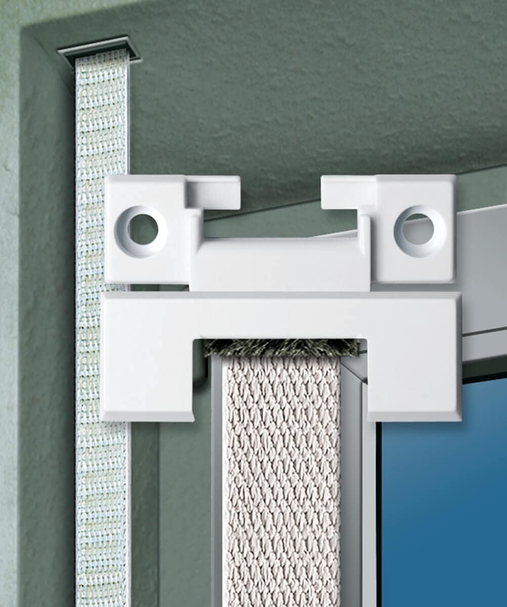 Du montierst die Gurtführung schnell und einfach ohne Ausbau des Rollladengurtes am Austritt des Gurtbandes unter dem Rollladenkasten. Der Rollladengurt wird dazu einfach seitlich in die Gurtführung geführt. Hinter der formschönen Abdeckung verschwinden die Schraublöcher und die Dichtungsbürste.