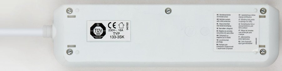 - Steckerleiste mit erhöhtem Berührungsschutz: Kunststoffplättchen verschließen die Kontakte der Steckdose