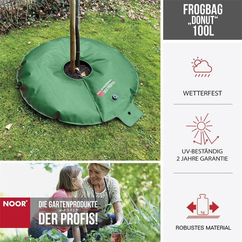 Der NOOR Frogbag "Donut" Bewässerungssack besitzt einen Durchmesser von Ø120 cm, eine einzigartige Form und bietet eine 6-8 stündige Wasserabgabe. Das spart nicht nur Zeit und Kosten, sondern, durch seine 2 Auslaufnippel, enorme Mengen an Wasser gegenüber einer einfachen Bewässerung, bei der ein Großteil des Wassers verdunstet.