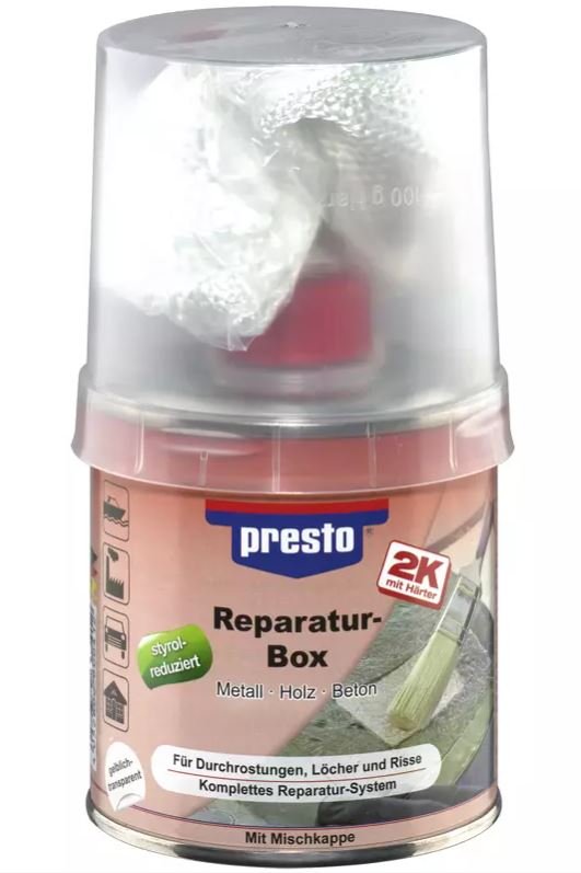 presto Reparaturbox ist eine Reparaturpackung mit ungesättigtem, elastifiziertem Polyesterharz, Härter sowie Glasfaservlies und Glasfasergewebe.