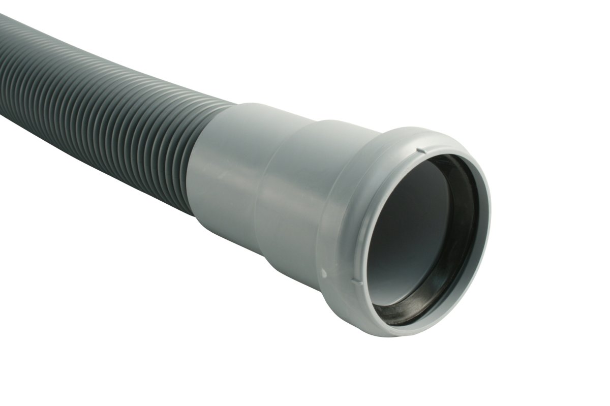 HT-Flexschlauch, flexibler Abwasserschlauch DN 50 aus grauem PP, mit angeschweißtem HT-Anschluss DN 50, Brandschutzklasse B2, schwer entflammbar.