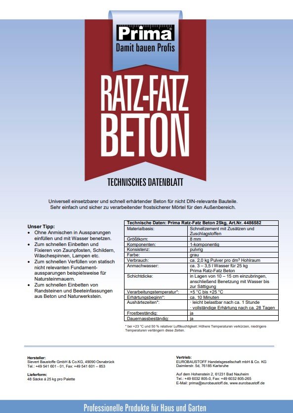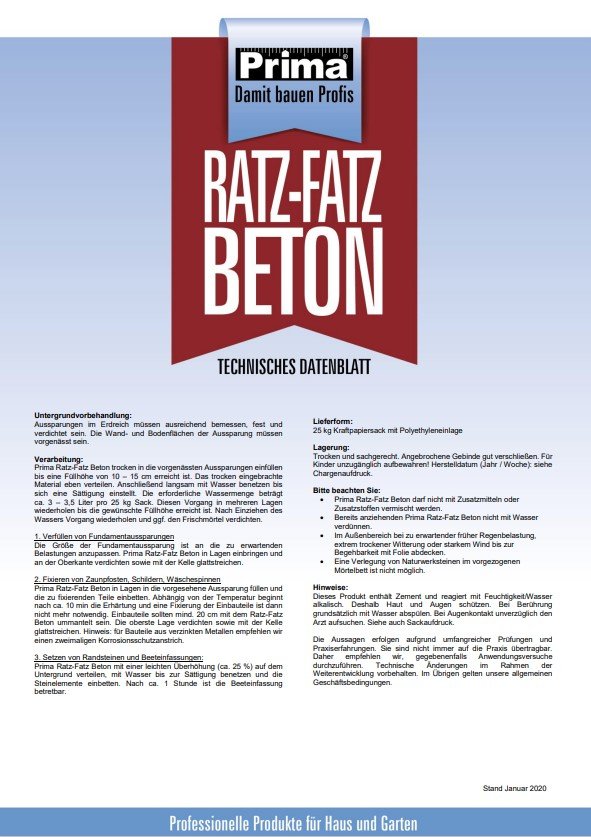 Prima Ratz-Fatz Beton ist ein universell einsetzbarer und schnell erhärtender Füll- und Bettungsmörtel. Er ist sehr einfach und sicher zu verarbeiten, frostsicher und dauernassbeständig und daher ideal für den Außenbereich.