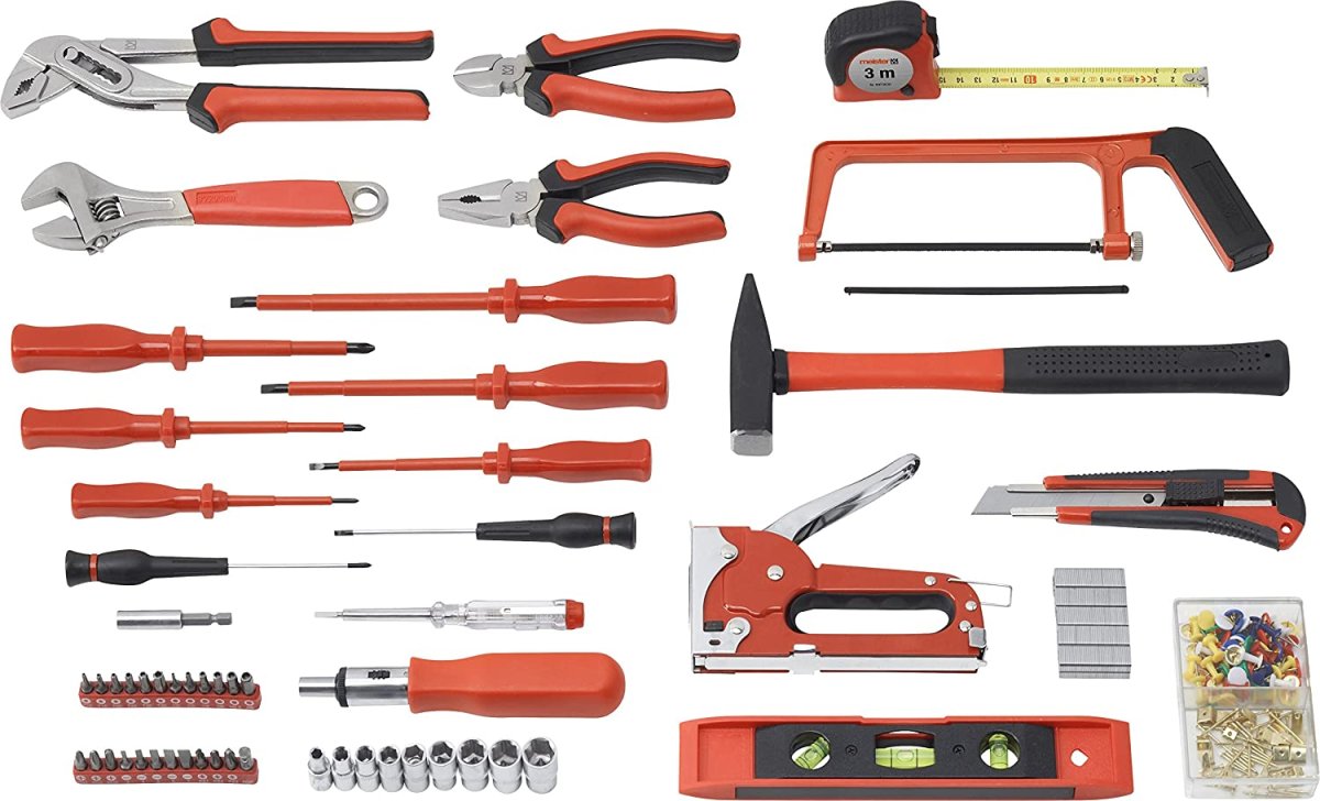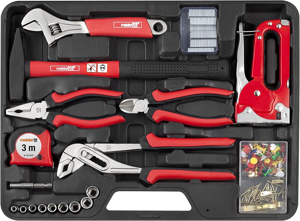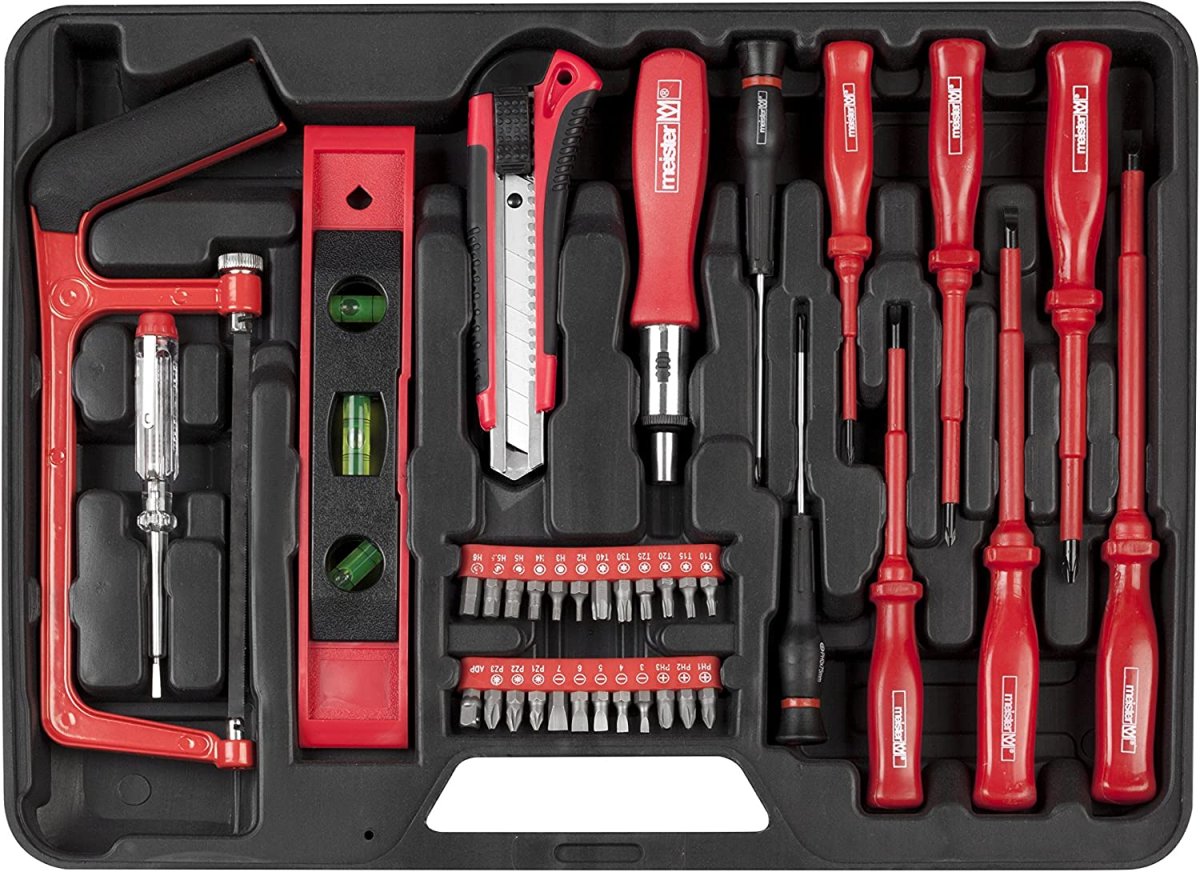 Mit dem 60-teiligen Werkzeugkoffer von Meister erhalten Sie ein solides Grundsortiment für alltäglich anfallende Arbeiten im Haushalt. Die Werkzeuge reichen vom Seitenschneider, Schlosserhammer und Wasserwaage bis hin zur Handsäge und Schraubendrehern. Die ausgewählten Produkte sind für alle Arbeiten rund ums Haus gebrauchsfähig und eignen sich für verschiedenste Anwendungen, von der Feinmechanik bis zur Montage.