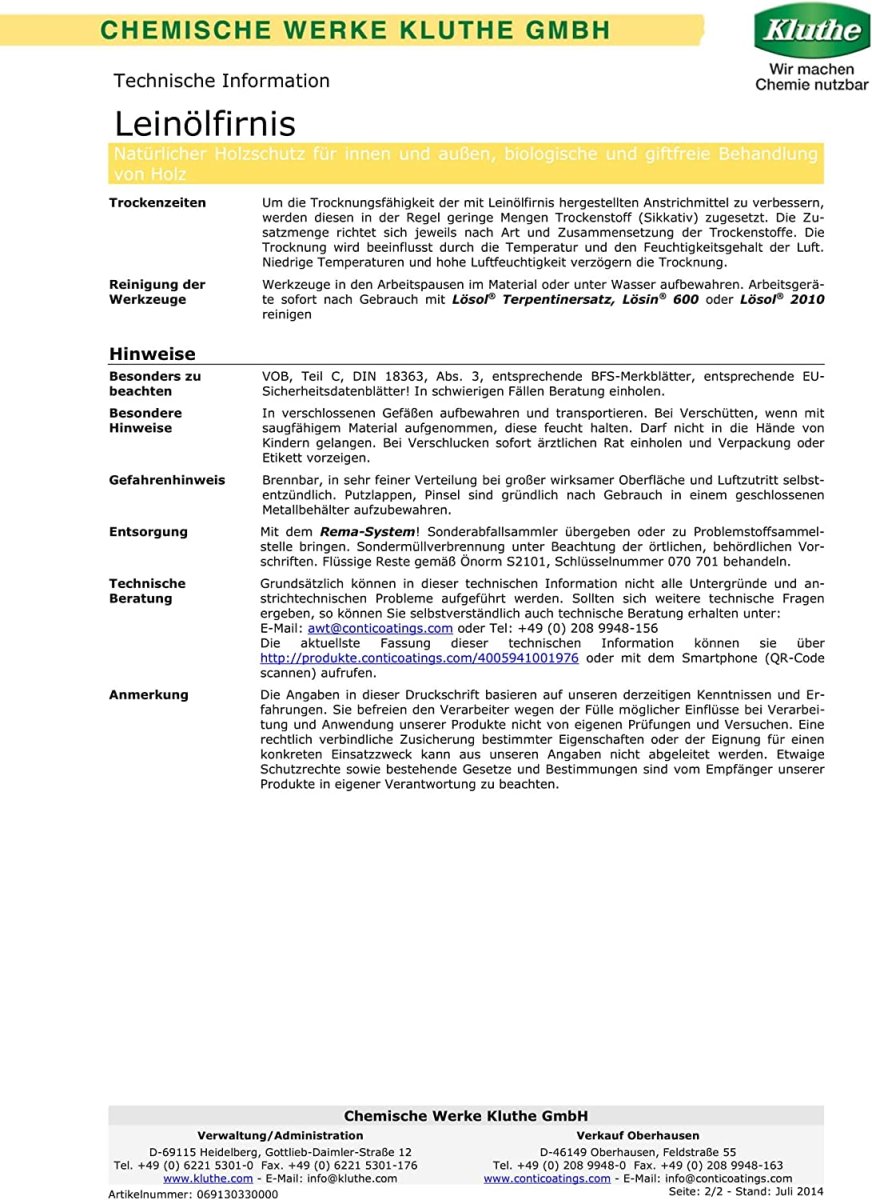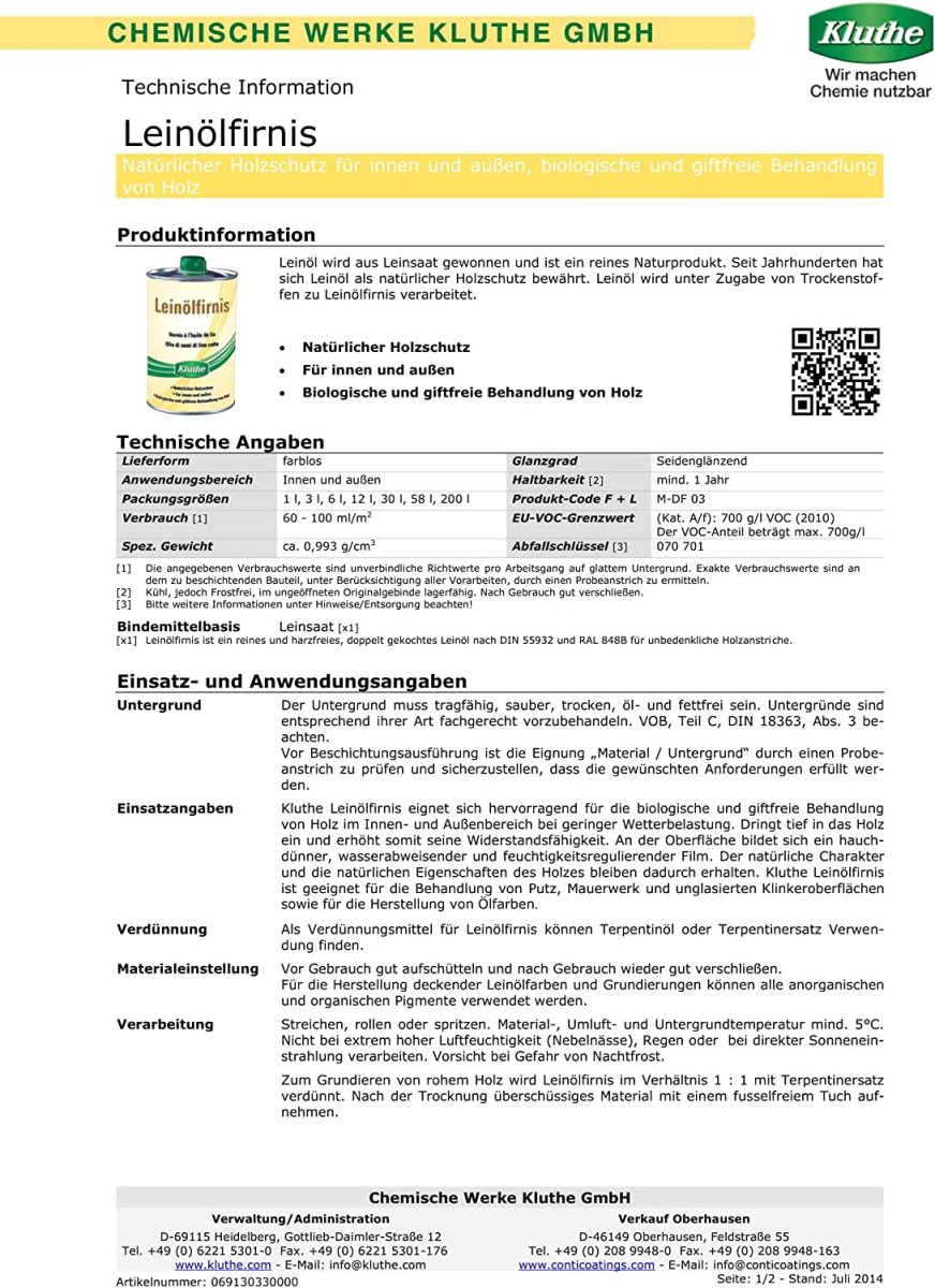 Kluthe Leinölfirnis eignet sich hervorragend für die biologische und giftfreie Behandlung von Holz im Innen- und Außenbereich bei geringer Wetterbelastung. Dringt tief in das Holz ein und erhöht somit seine Widerstandsfähigkeit.