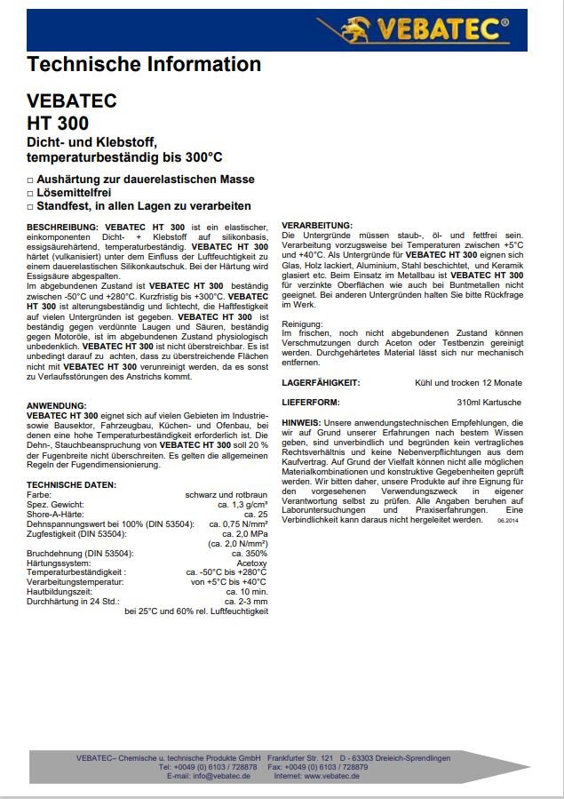 Vebatec HT 300 ist ein elastischer 1-Komponenten-Dicht- und Klebstoff auf Silikonbasis, essigsäurehärtend, hochhitzefest. Vebatec HT 300 härtet (vulkanisiert) unter dem Einfluss der Luftfeuchtigkeit zu einem dauerelastischen Silikonkautschuk. Bei der Härtung wird Essigsäure abgespalten.