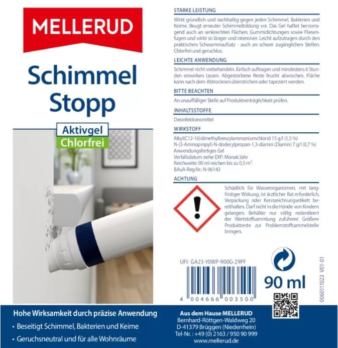 Das MELLERUD Schimmel Stopp Aktivgel chlorfrei in der praktischen 90 ml Tube wirkt gründlich und nachhaltig gegen jeden Schimmel, Bakterien und Keime auf nahezu allen Oberflächen.