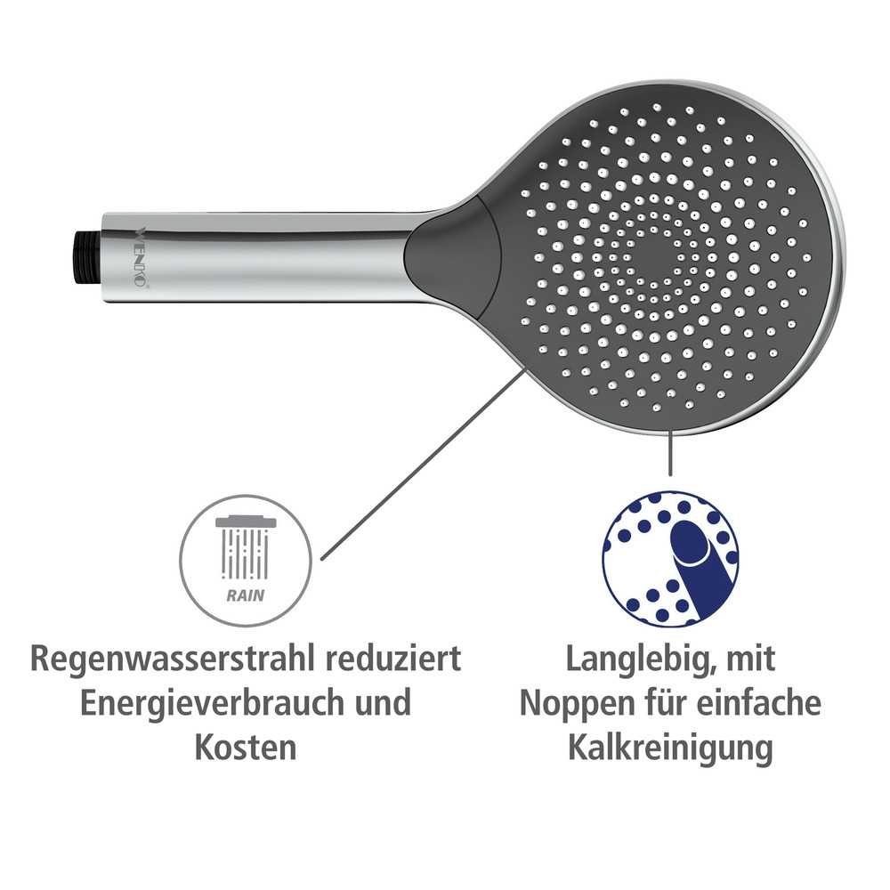 Der klassische Brausekopf aus stabilem ABS mit glänzender Chrom-Ummantelung ist mit praktischen Noppen ausgestattet, die für eine einfache Kalkreinigung und eine lange Nutzungsdauer sorgen. Eventuelle Kalkablagerungen an den Düsen können einfach mit den Fingern abgerieben werden.
