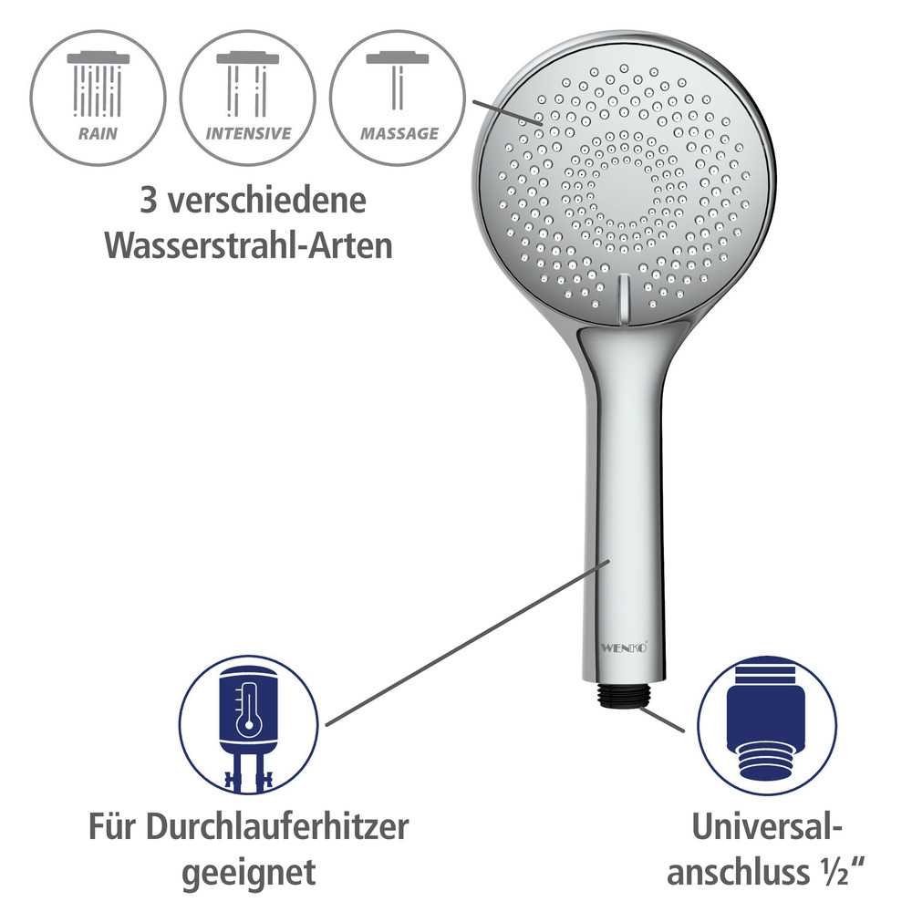 Das innovative Duschkopf-Sortiment von WENKO überzeugt durch Funktionalität, Design und Qualität und verwandelt Ihr Badezimmer in eine Wellness-Oase. Bei der Watersaving Universal-Handbrause können Sie neben der Regenstrahl-Funktion, die wie ein sanfter Tropenschauer entspannt, zwischen vier weiteren Strahlarten wählen: Genießen Sie die belebende Massage- oder die starke Intensive-Funktion sowie Soft-Versionen dieser Strahlarten je nach Belieben.