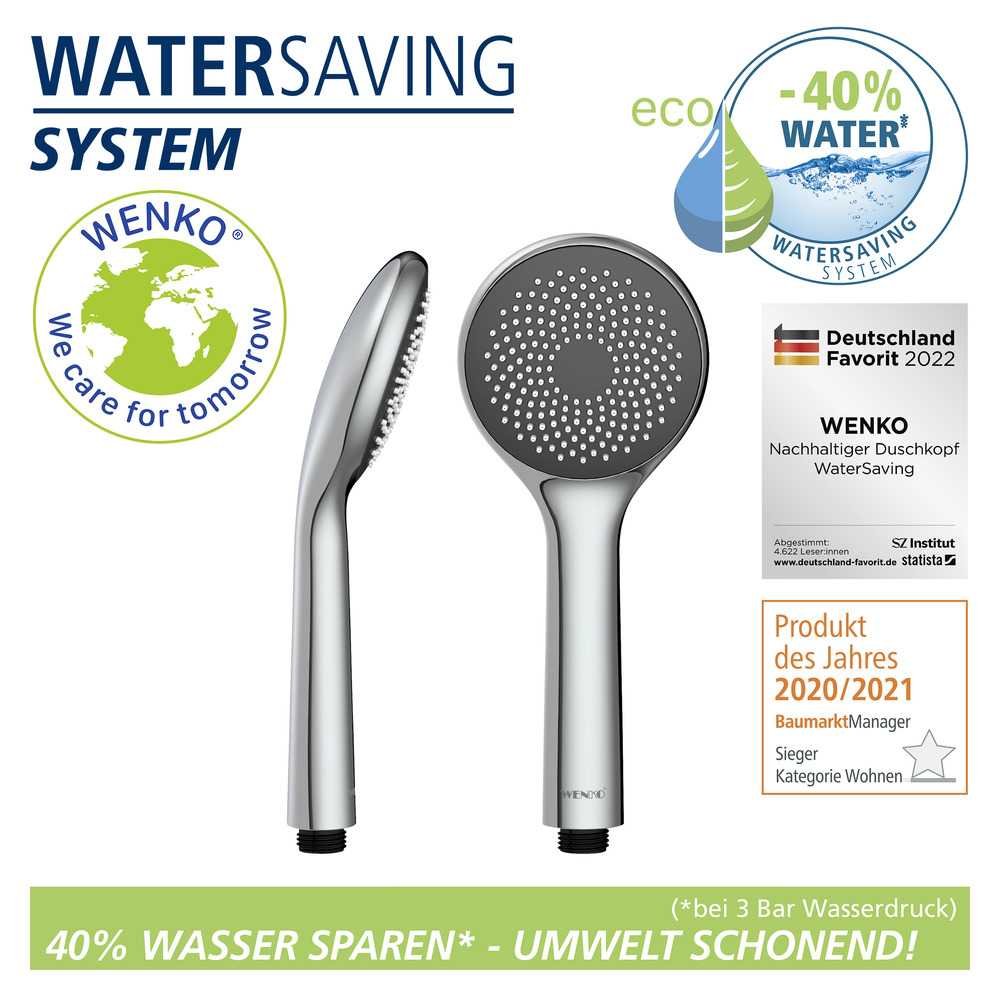 Auch bei Duschköpfen setzt WENKO auf Nachhaltigkeit! Mit den Watersaving Duschköpfen sparen Sie Wasser, Energie und Geld. Alle Modelle mit dem nachhaltigen Watersaving System sind so konzipiert, dass mit Hilfe eines Wasserspareinsatzes weniger als 8 Liter Wasser pro Minute verbraucht werden (bei 3 Bar Wasserdruck) ohne, dass es bewusst wahrgenommen wird. So werden 40% Wasser gespart bei vollem Komfort - denn ein konstanter Durchfluss mit sattem Wasserstrahl ist nach wie vor gewährleistet.