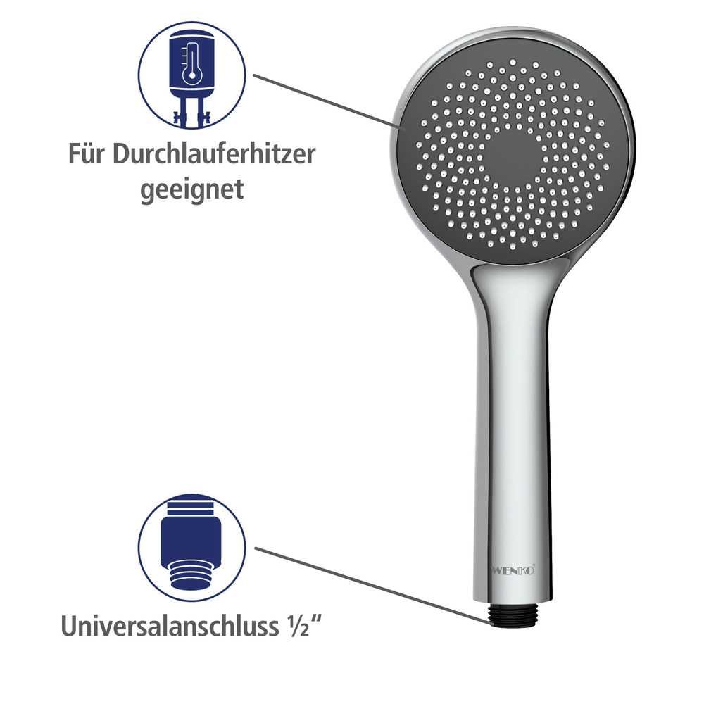 Die komfortable Duschbrause verfügt über einen Universalanschluss mit ½“ und ist natürlich auch für Durchlauferhitzer geeignet.