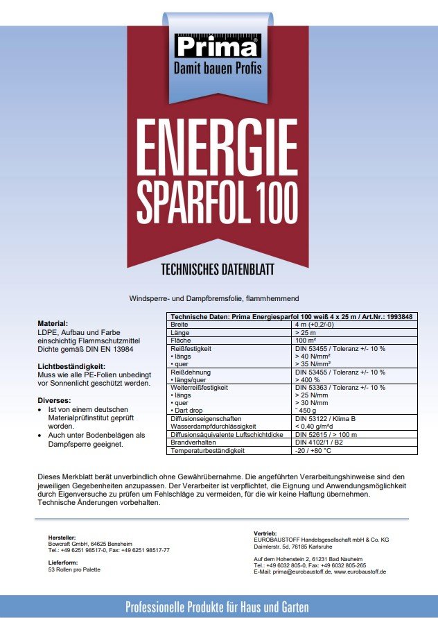 Als Dampfbremsfolie für Steildächer, Flachdächer und Holzbalkendecken schützt die Prima Energiesparfol 100 (ca. 100g./qm) dauerhaft vor Feuchtigkeit und Bauschäden. Mit einem sd-Wert von 100m gewährleistet die Folie einen sicheren Schutz.
