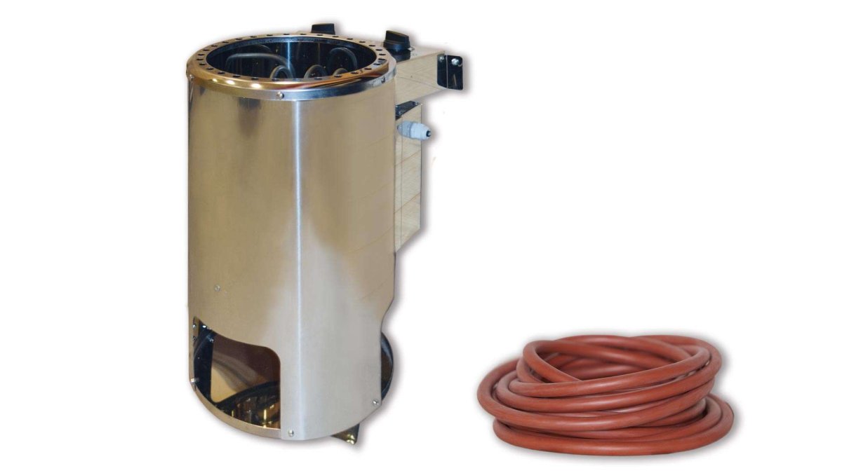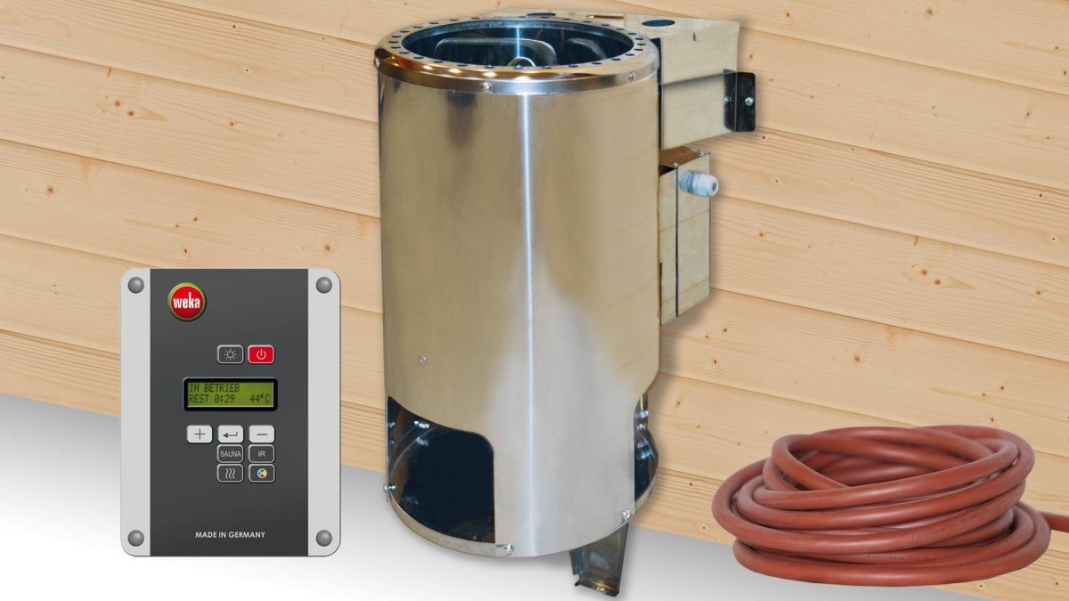 - inklusive 3,6 kW Kompaktofen und Silikonkabelset oder inklusive 3,6 kW BioS Saunaofen, digitaler Steuerung und Silikonkabelset