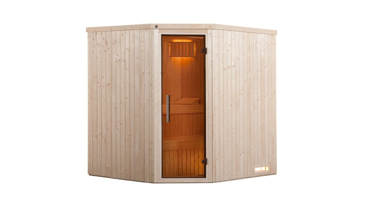 - 230-V-Sauna aus naturbelassenem Fichtenholz