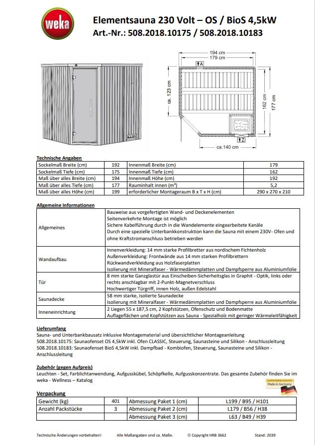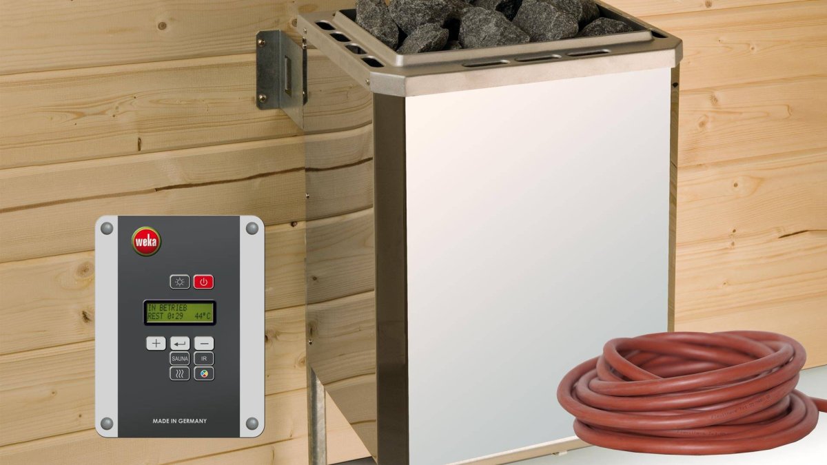 - inklusive 4,5 kW Saunaofen OS, digitaler Steuerung und Silikonkabelset oder inklusive 4,5 kW BioS Saunaofen, digitaler Steuerung und Silikonkabelset