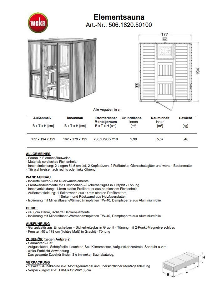 - Außenmaß: 177 x 194 x 199 cm (BxTxH)