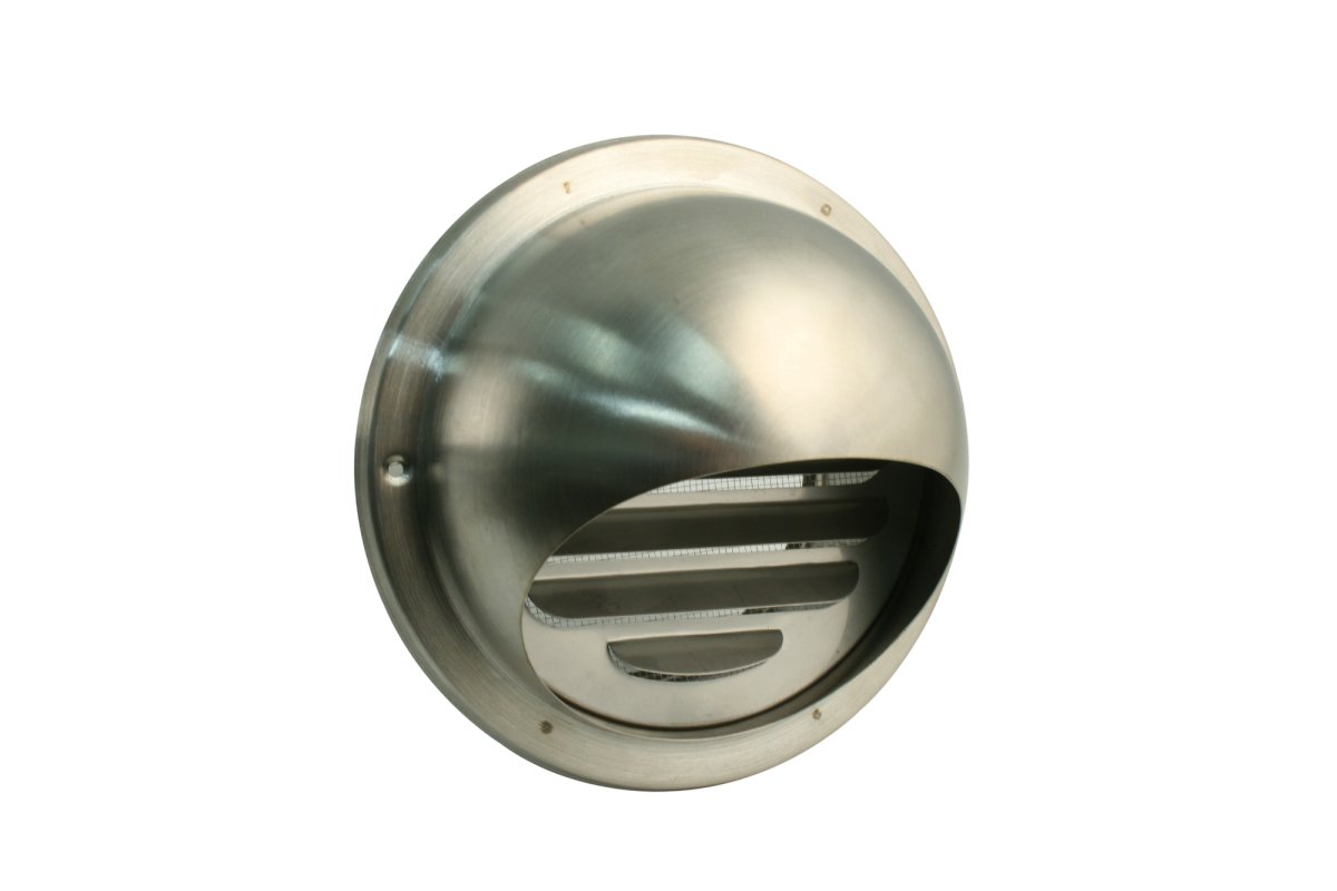 Ablufthaube aus Edelstahl für außen, mit Fliegengaze aus Edelstahl, 2 Edelstahlschrauben 3,5 x 40 mm und 2 Dübeln.