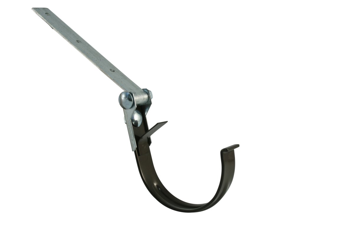 Shop » Detailansicht Rinneneisen verzinkt und kunststoffbeschichtet, mit hinterer Feder und Drehgelenk, braun - Halbrunde Dachrinne RG 100