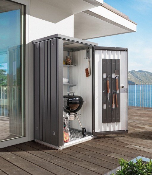 Mit dem Biohort-Gartenschrank können Sie Gartengeräte, Werkzeug, Spielsachen u. ä. regenwassergeschützt und diebstahlsicher verstauen. Er fügt sich, durch die kompakte Größe und dank seines eleganten Designs, harmonisch an seinem Standort ein.
