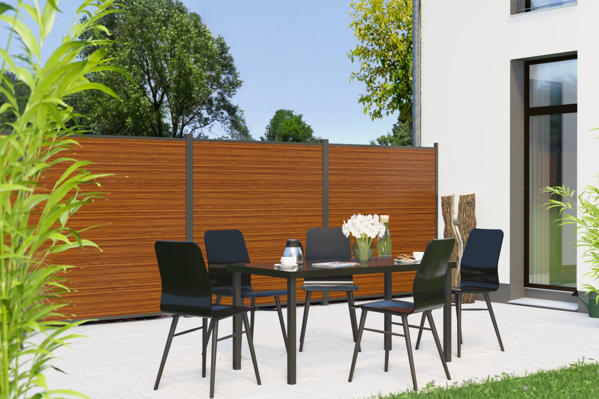 Das Zaunfeld-Set ALU PLUS besteht aus 12 abwaschbaren, 20 x 150 mm starken Nut-und-Feder-Profilen aus Aluminium und einem Metall-Abschlussleistenset.