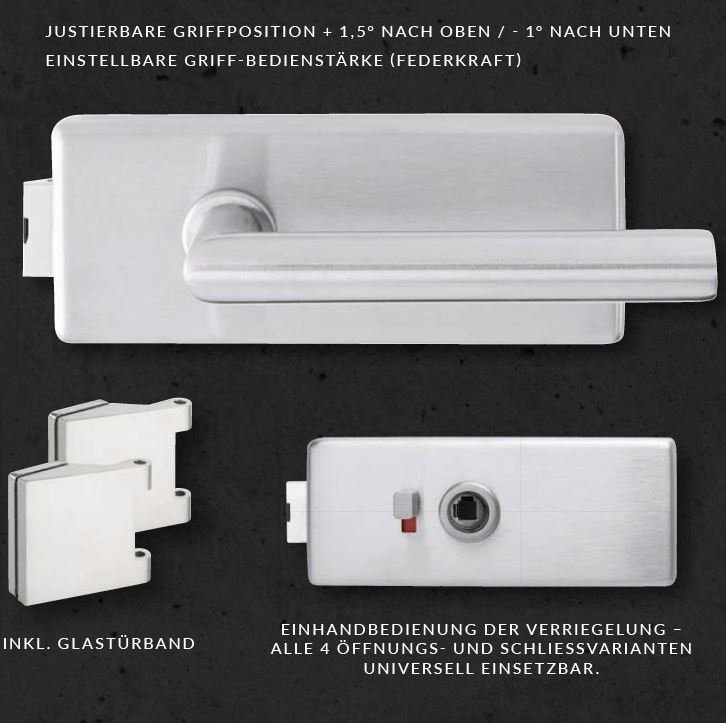 - für Ganzglas-Drehtüren, 8 mm ESG Glas mit Bandbohrung Office, Schlossbohrung Studio