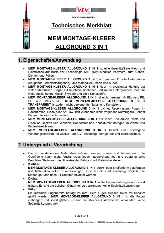 MEM MONTAGE-KLEBER ALLGROUND 3 IN 1 ist eine lösemittelfreie Kleb- und Dichtmasse auf Basis der Technologie SMP (Silyl Modified Polymers) zum Kleben, Dichten und Füllen.
