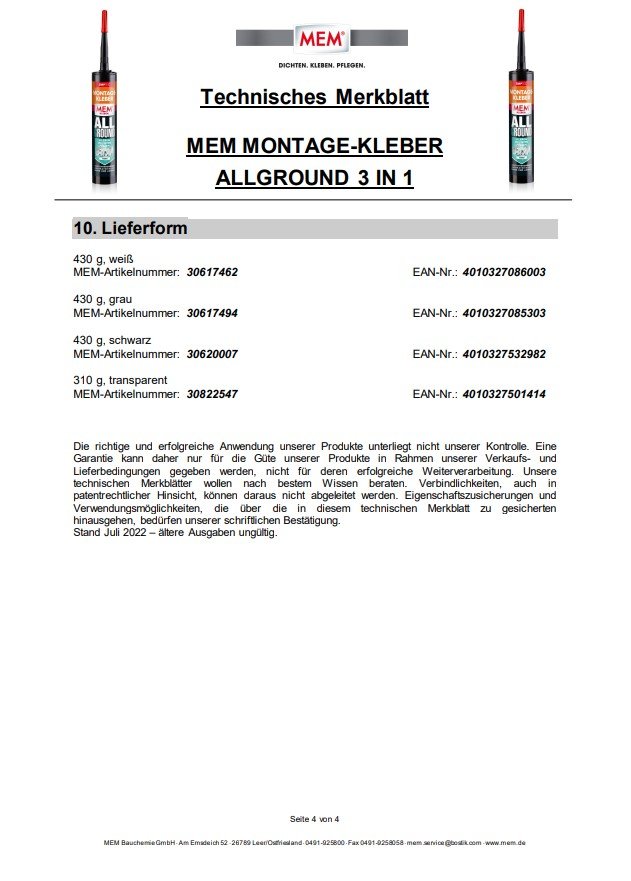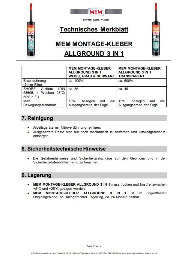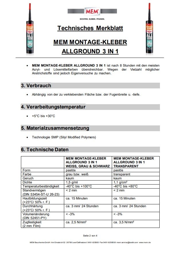 MEM MONTAGE-KLEBER ALLGROUND 3 IN 1 weist eine überlegene Witterungsstabilität auf und ist wasser- und UV-beständig, überstreichbar und korrigierbar.