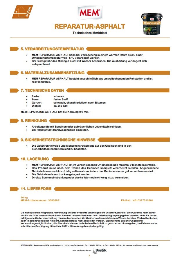 MEM REPARATUR-ASPHALT ist ein gebrauchsfertiges, kalt verarbeitbares Asphaltgemisch zum Ausbessern von Schlaglöchern, zur Beseitigung von Fahrbahnschäden, zum Schließen von Aufbrüchen und zur Herstellung von Anrampungen.