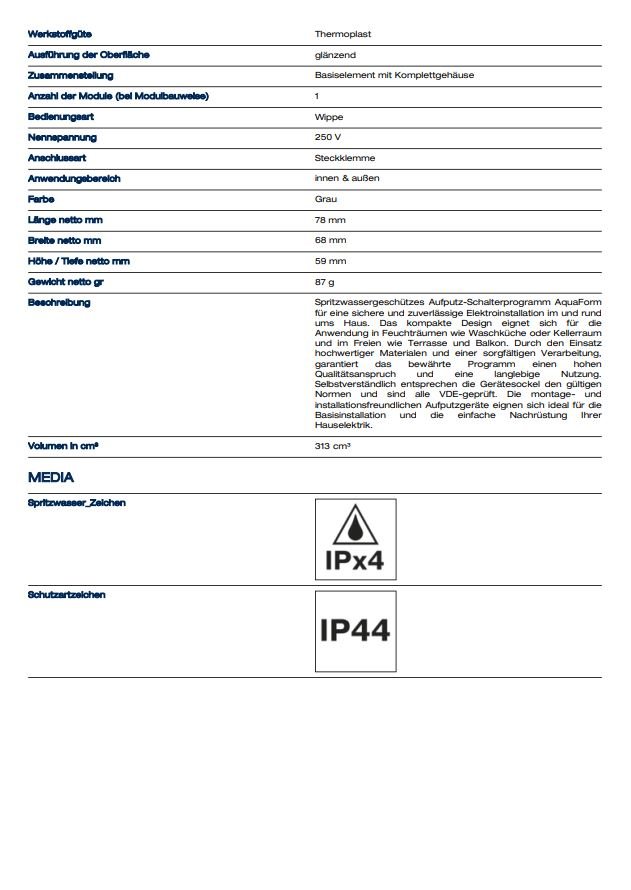 Spritzwassergeschützes Aufputz-Schalterprogramm AquaForm für eine sichere und zuverlässige Elektroinstallation im und rund ums Haus. Das kompakte Design eignet sich für die Anwendung in Feuchträumen wie Waschküche oder Kellerraum und im Freien wie Terrasse und Balkon. Durch den Einsatz hochwertiger Materialen und einer sorgfältigen Verarbeitung, garantiert das bewährte Programm einen hohen Qualitätsanspruch und eine langlebige Nutzung. Selbstverständlich entsprechen die Gerätesockel den gültigen Normen und sind alle VDE-geprüft. Die montage- und installationsfreundlichen Aufputzgeräte eignen sich ideal für die Basisinstallation und die einfache Nachrüstung Ihrer Hauselektrik.