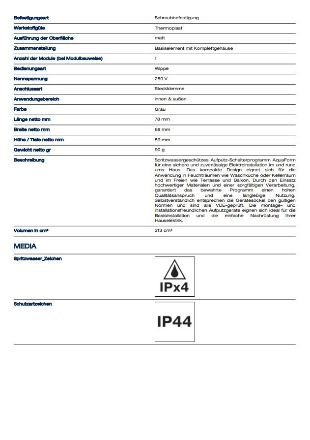 Spritzwassergeschützes Aufputz-Schalterprogramm AquaForm für eine sichere und zuverlässige Elektroinstallation im und rund ums Haus. Das kompakte Design eignet sich für die Anwendung in Feuchträumen wie Waschküche oder Kellerraum und im Freien wie Terrasse und Balkon. Durch den Einsatz hochwertiger Materialen und einer sorgfältigen Verarbeitung, garantiert das bewährte Programm einen hohen Qualitätsanspruch und eine langlebige Nutzung. Selbstverständlich entsprechen die Gerätesockel den gültigen Normen und sind alle VDE-geprüft. Die montage- und installationsfreundlichen Aufputzgeräte eignen sich ideal für die Basisinstallation und die einfache Nachrüstung Ihrer Hauselektrik.
